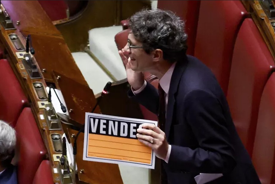 Il segretario di +Europa Riccardo Magi mentre protesta in Aula con il cartello “Vendesi” criticando il ricorso alla decretazione d’urgenza e parlando di un Parlamento svuotato di ruolo.